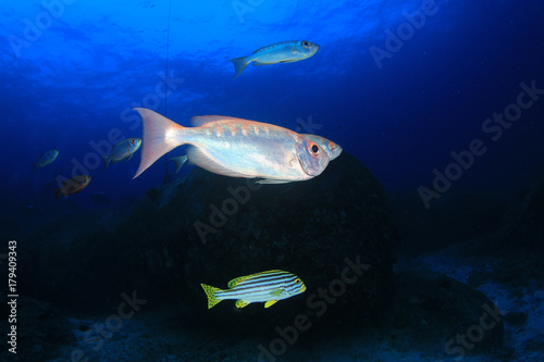 Fototapeta premium Fish school in ocean. Snapper fish on coral reef