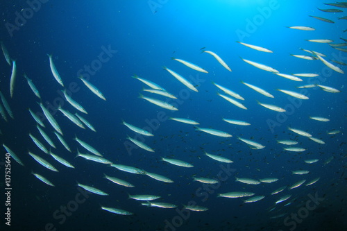 Fototapeta premium Fish school underwater. Barracuda fish in ocean