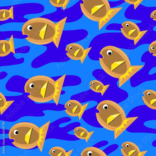 Fototapeta premium Fish seamless pattern: yellow and brown pisces on a blue background.