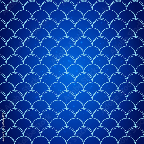 Fototapeta premium Fish skin on trendy gradient background. Square backdrop with fish skin ornament. Bright color transitions. Mermaid tail banner and invitation. Underwater and sea pattern. Deep blue colors.