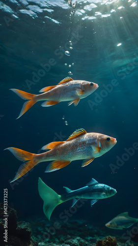 © Swetlana, Fototapeta premium Fish stand in the thick of the tropical sea, the ocean floor is covered with coral. Sunlight shines through the water column.