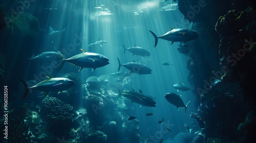© MDJAHID, Fototapeta premium fish swim divine groups of underwater background,generative ai