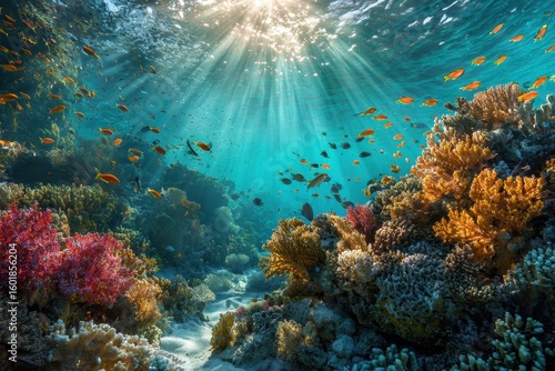 Fototapeta premium Fish swim near coral reefs under shining sun in ocean. For conservation, tourism