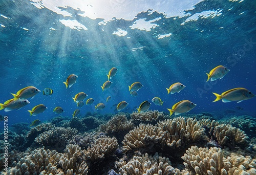 Naklejka premium Fish swimming above coral reef with sunlight rays
