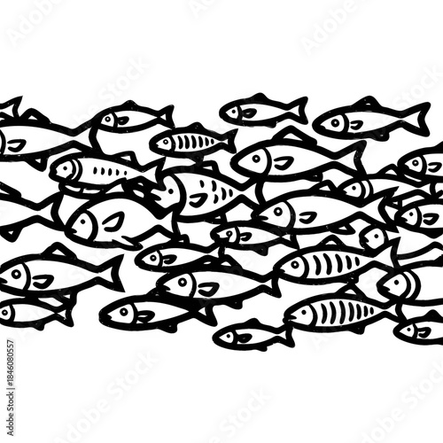 © Md, Naklejka premium Fish swimming in a line: A minimalist illustration of a school of fish swims together creating a harmonious line