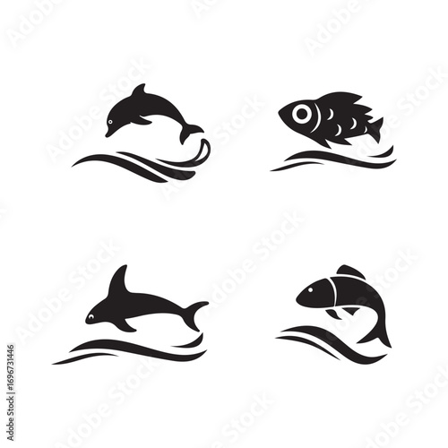 Fototapeta premium Fish swimming over waves, ocean wave with fish icon, fish Silhouette Swimming, collection of fish icon with waves, vector illustration
