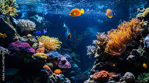 © GoldPumaze, Obraz premium Fish swimming peacefully in a large tank with vibrant coral.