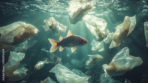 Obraz premium Fish Swimming Through Sea of Plastic Bags