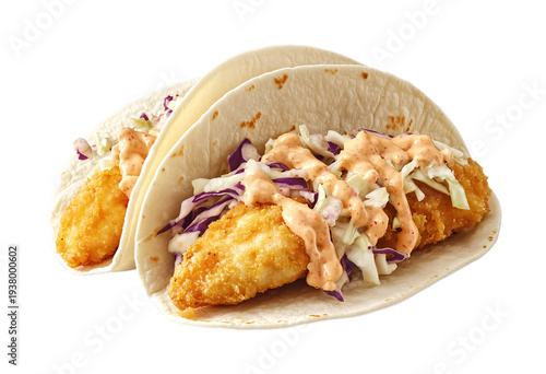 © Mahemud, Fototapeta premium Fish Tacos with Cabbage Slaw - Fresh and Tangy Mexican Dish - Isolated on White Background