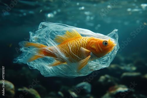 Naklejka premium Fish Trapped in Plastic Underwater, Highlighting Marine Pollution and...