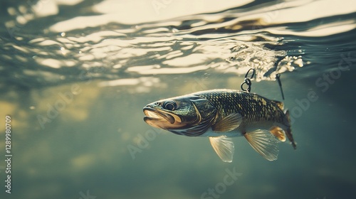Obraz premium Fish underwater, hooked, sunlight, water ripples