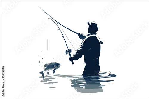© ROJOB, Obraz premium Fisherman at Peaceful Mountain Lake and vector silhouette
