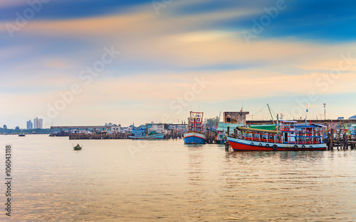 Fototapeta premium fisherman boat docking at pier in the sunset