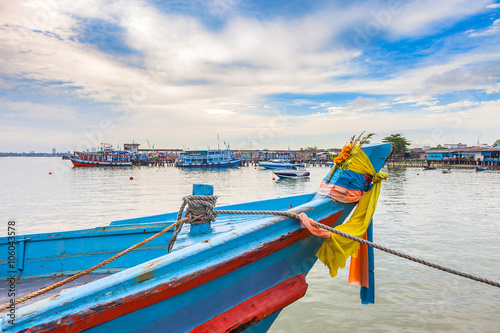 Fototapeta premium fisherman boat docking at pier in the sunset