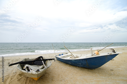 © amirul syaidi, Naklejka premium fisherman boat stranded on the sandy beach and cloudy sky.