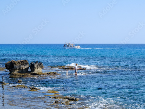 © Михаил Уванов, Fototapeta premium fisherman catches fish on the rocky seashore