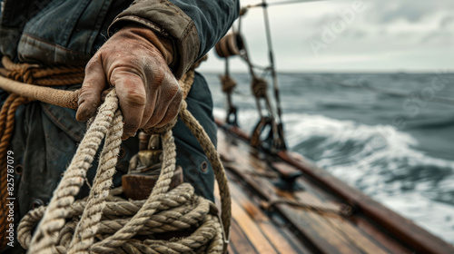 © Thanos, Obraz premium Fisherman Handling Rope on Sailboat's Weathered Deck