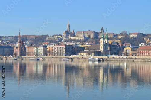 Obraz premium Fisherman's Bastion is a terrace in neo-Gothic and neo-Romanesque style situated on the Buda bank of the Danube, on the Castle hill in Budapest, around Matthias Church in Budapest, Hungary