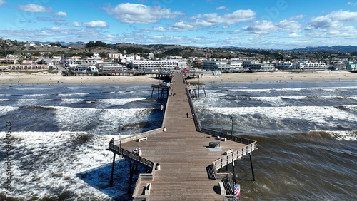 © bydronevideos, Obraz premium Fishermans Wharf At Pismo Beach In California United States. Nature Tourism Travel. Sunny Day Landscape. Fishermans Wharf At Pismo Beach In California United States.