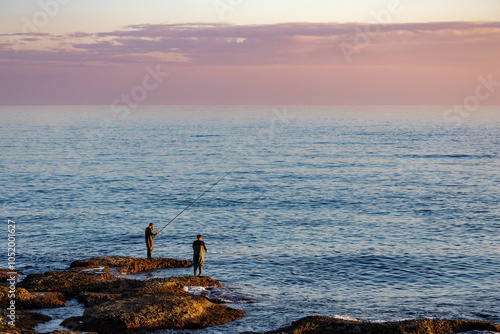 © Vlad Rakin, Fototapeta premium Fishermen on beach at sunset. Antalya, Turkey