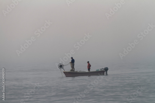 © Goran, Naklejka premium Fishermen on the boat in foggy morning, Long Beach in Ulcinj in Montenegro