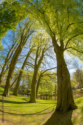 © Aliaksei, Obraz premium Fisheye View of Sunlit Beech Trees by the Pond in Spring Park