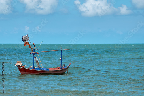 © wiwat, Fototapeta premium Fishing Boat Anchored in Turquoise Waters off the Coast During a Clear Sunny Day With Scattered Clouds