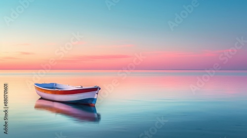 © Exnoi, Naklejka premium Fishing boat anchored near a quiet beach at dawn, peaceful and traditional.