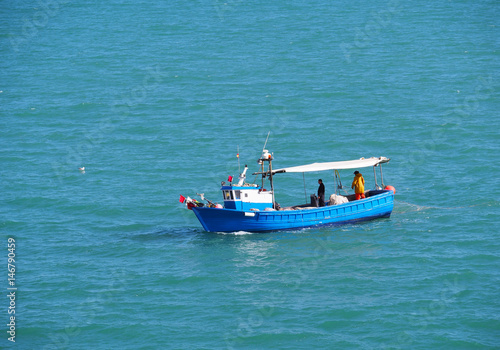 © spanish_ikebana, Naklejka premium Fishing boat and fisherman in sea . Spain. 15.07.2016