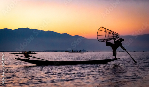 Naklejka premium fishing boat at sunrise - Inle Lake - Myanmar