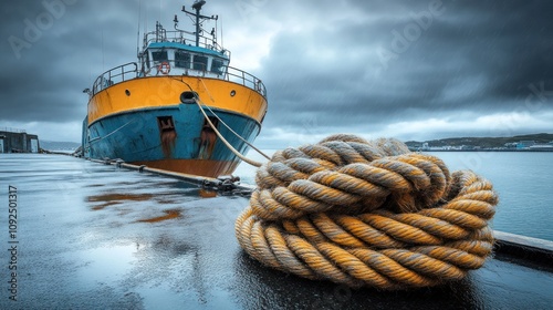 Fototapeta premium Fishing boat docked with coiled rope in foreground.