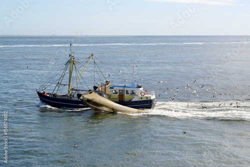 © Vincent, Naklejka premium Fishing boat dragging a net throught the water of the Waddensea, The Netherlands. Lots of seagulls