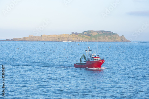 © poliki, Naklejka premium Fishing boat entering Bermeo with the island of Izaro in the background, Euskadi