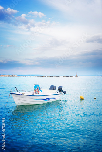 © neirfy, Naklejka premium Fishing boat floating in water of Zaante town, beautiful detail of Zakinthos island, Greece, retro toned