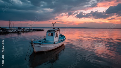 Naklejka premium Fishing boat gently bobbing on the water at sunset, with Le Morn Brabant in...