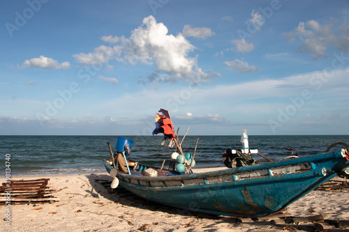 Fototapeta premium fishing boat on a lonesome beach with white sand and blue water somewhere in...