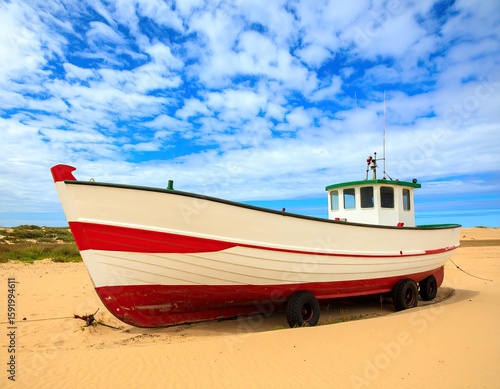 © Riska, Naklejka premium Fishing boat on a sandy beach under a partly cloudy sky