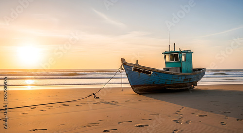 © AmineStock33, Fototapeta premium Fishing Boat On Beach At Sunset