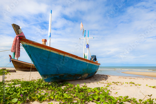 Fototapeta premium Fishing boat on sand beach and blue sky