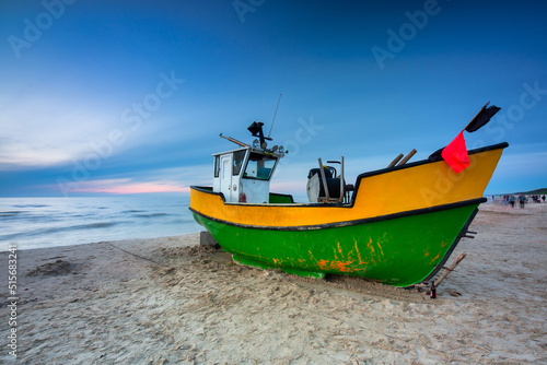 © Patryk Kosmider, Fototapeta premium Fishing boat on the Baltic Sea beach in Jantar. Poland