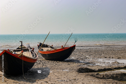 Fototapeta premium fishing boat on the beach at sunset in mousuni Island