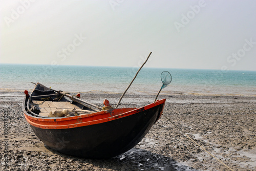 Fototapeta premium fishing boat on the beach at sunset in mousuni Island