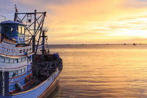 © singkamc, Fototapeta premium Fishing boat on the beach when sunset