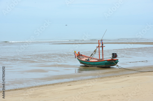 Fototapeta premium fishing boat on the beach with see and blue sky background in Thailand
