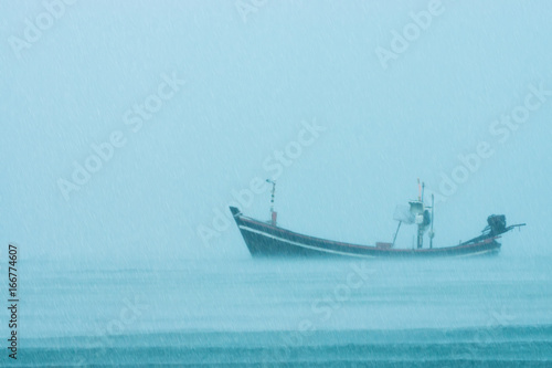 Fototapeta premium Fishing boat on the sea with raining in the sea.