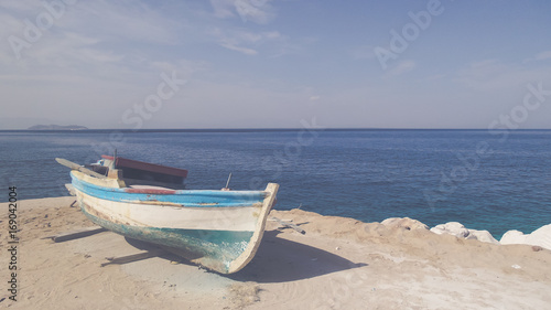 Naklejka premium Fishing boat on the shore of Aegean sea