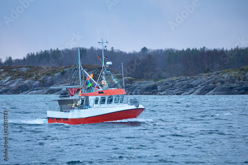 Naklejka premium Fishing boat on trip to Lofoten to fish in Northern Norway