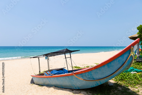 Naklejka premium Fishing boat on tropical beach, summer outdoor day light
