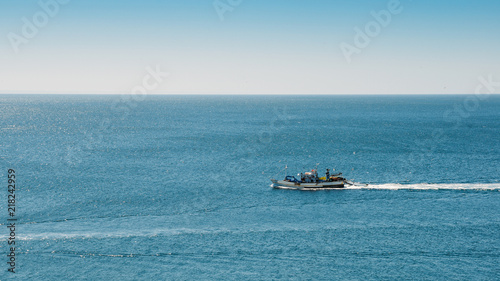 Naklejka premium Fishing boat returning to home harbor, Portugal