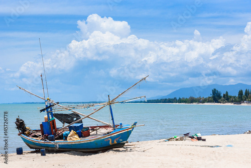 Fototapeta premium Fishing boats aground on the beach over cloudy sky at Prachuap Khiri Khan, Thailand.